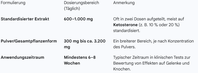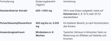 Studien verwenden oft Cissus-Extrakte, die auf einen niedrigeren Ketosteron-Gehalt standardisiert sind (z. B. 2,5 % oder 10 %). Wenn man die Menge an reinen Ketosteronen betrachtet, ergeben sich folgende Anhaltswerte: