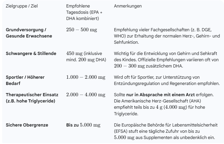 Die Dosierungsempfehlungen für Omega-3-Fettsäuren (EPA und DHA kombiniert) variieren je nach Gesundheitsziel, Alter und nationalen Richtlinien. Es gibt keine einheitliche empfohlene Tagesdosis (RDA) von offizieller Seite, aber die meisten Gesundheitsorganisationen legen Mindest- und Höchstwerte fest.